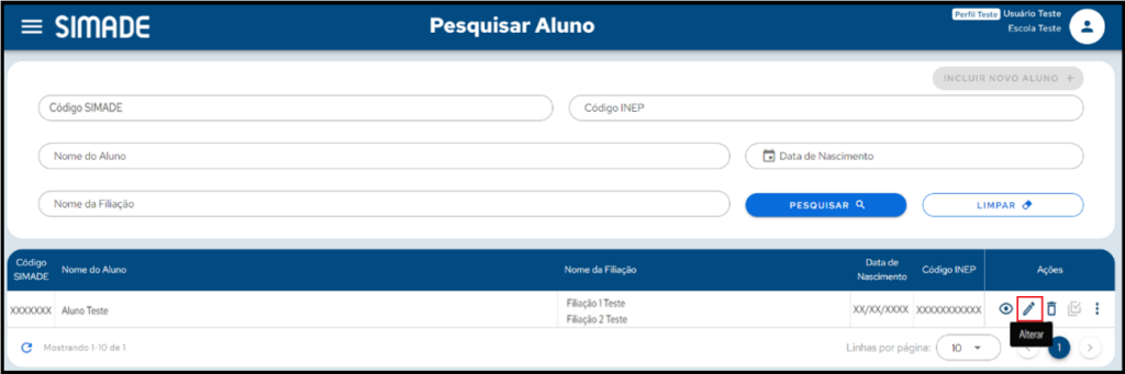 Após pesquisar e encontrar o aluno na base de dados do Simade, clique em Alterar.