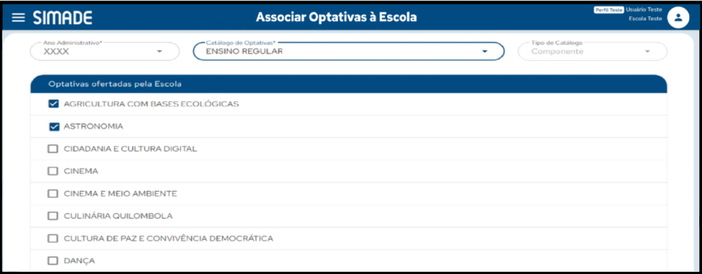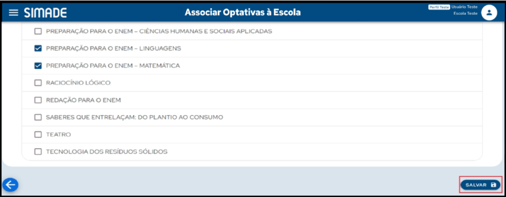 Para associar as optativas à escola, portanto, basta selecionar as optativas desejadas por meio do campo de seleção e clicar em salvar no canto inferior direito da página. Caso deseje cancelar essa operação, clique na seta no canto inferior esquerdo para voltar à página inicial do sistema.