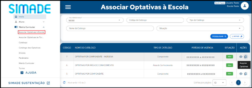 4 de janeiro de 2024 - 1 min de leituraPara acessar essa funcionalidade, clique em Associar Optativas às Escolas no menu Matriz Curricular. Nessa página é possível associar as optativas em que o usuário realizou o login. Para isso, é necessário preencher os campos Catálogo das Optativas e Ano Administrativo, sendo que o campo Ano administrativo é de preenchimento obrigatório.