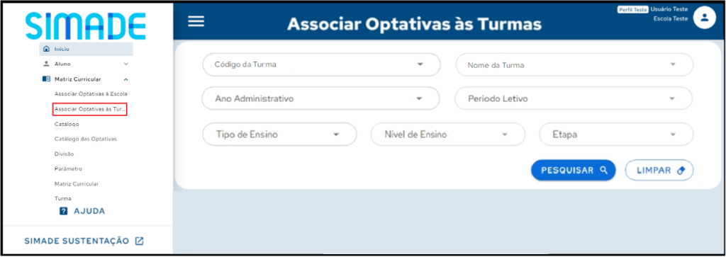 4 de janeiro de 2024 - 1 min de leituraPara acessar essa funcionalidade, clique em Associar Optativas às Turmas no menu Matriz Curricular. Nessa página é possível associar as optativas às turmas. Para isso, é necessário pesquisar uma turma.