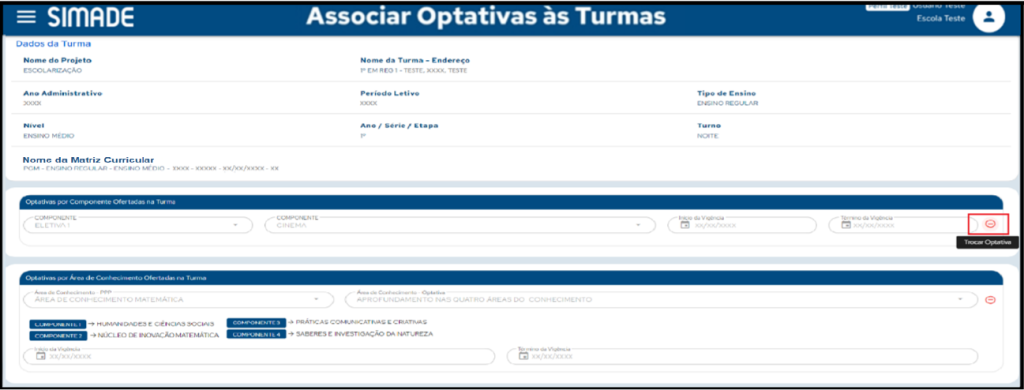 Ao clicar em Associar Optativas, é apresentada uma página que permite o preenchimento das optativas que serão associadas à turma selecionada. Preenchidas as informações, clicar em Salvar.