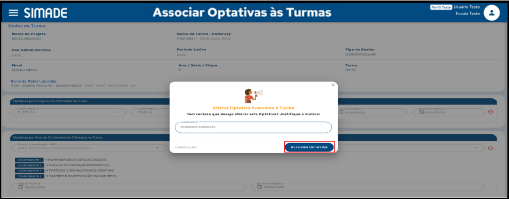 É possível também realizar a troca da optativa na turma. Clicar sobre o ícone Trocar Optativa, ao clicar no ícone abrirá a tela permitindo informar a justificativa e será liberado o campo para escolha de nova optativa, sendo que não é possível realizar troca da optativa em turma com docentes associados.