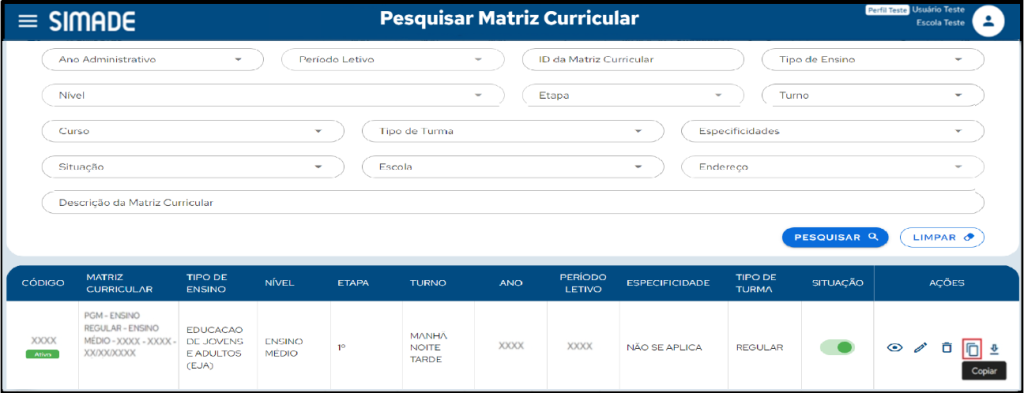 8 de janeiro de 2024 - 1 min de leituraÉ possível criar um nova Matriz Curricular aproveitando todas as informações de outra Matriz Curricular. Para isso, clique em Copiar, na coluna Ações da Matriz Curricular que se deseja copiar.