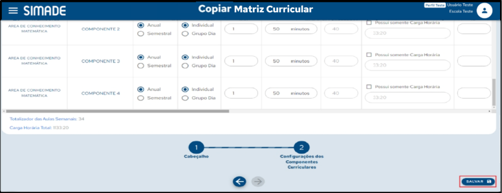 Será aberta a página Copiar Matriz Curricular, com as informações copiadas da Matriz Curricular selecionado, sendo possível alterá-las, se necessário. Navegue entre as páginas de informações do Cabeçalho e Configurações dos Componentes Curriculares. Para finalizar, clique em Salvar.