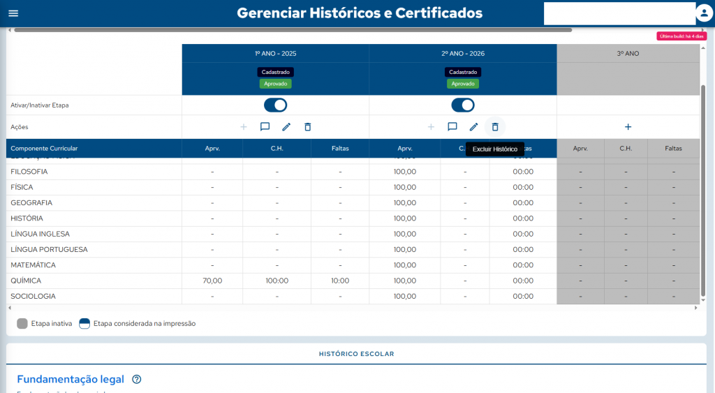 - Será aberto um modal de confirmação (ex.: “Deseja realmente excluir o Histórico Cadastrado para a etapa 1º ANO?”) com os botões CANCELAR e CONFIRMAR.