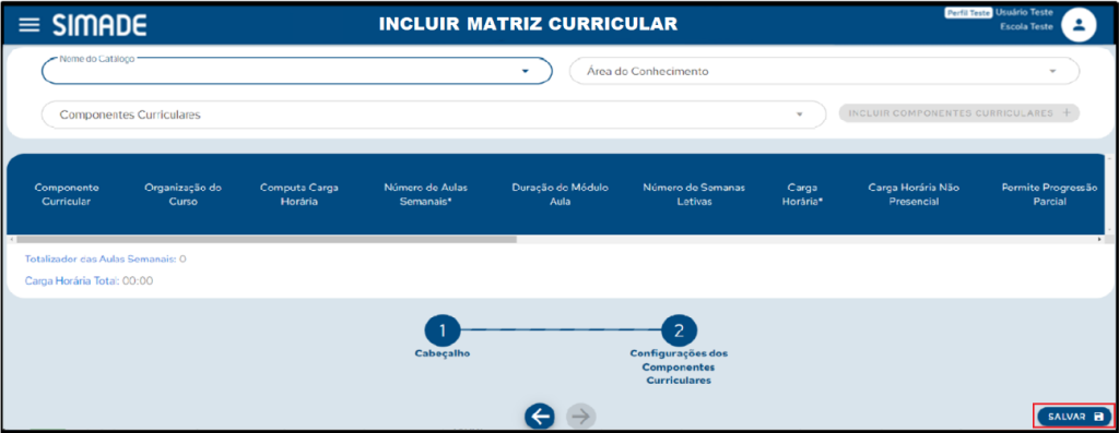 Para incluir uma nova divisão, clique no botão Incluir Nova Matriz Curricular no canto superior direito da tela Pesquisar Matriz Curricular. Será aberta a tela Incluir Matriz Curricular com os campos a serem preenchidos. Preencha os campos referentes ao cabeçalho e as configurações dos componentes curriculares. Navegue entre as páginas por meio das setas. Preenchidas todas as informações, clique em Salvar.