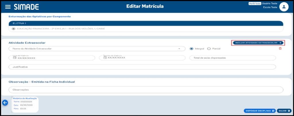 Após acionar o comando Atividade Extraescolar será exibido ao painel com os campos disponíveis.