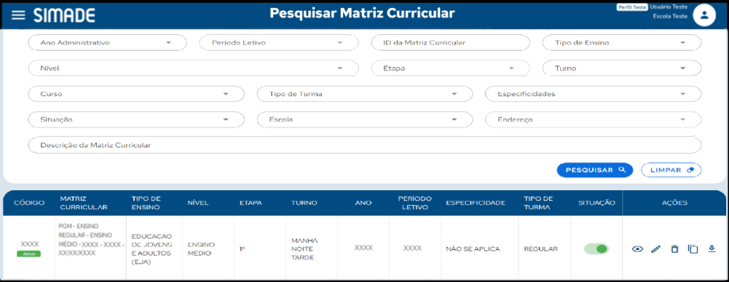 Ao clicar em Pesquisar serão exibidos as Matriz Curriculares, conforme os filtros especificados. Para cada Matriz Curricular são exibidos Código, Matriz Curricular, Tipo de Ensino, Nível, Etapa, Turno, Especificidade, Tipo de Turma, Situação e as Ações (Visualizar, Alterar, Excluir, Copiar e Exportar).