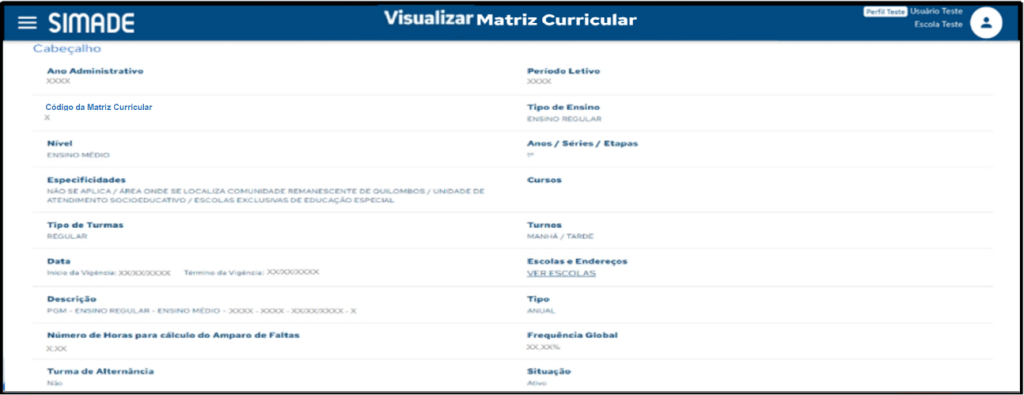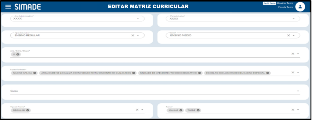 8 de janeiro de 2024 - 2 min de leituraPara acessar esta funcionalidade clique na opção Matriz Curricular no menu Matriz Curricular. É possível pesquisar por meio dos campos ID da Matriz Curricular, Tipo de Ensino, Nível, Etapa, Situação, Curso, Turno, Especificidades, Tipo de Turma, Descrição da Matriz Curricular, Escola e Endereço e dos campos Ano Administrativo e o Período Letivo.