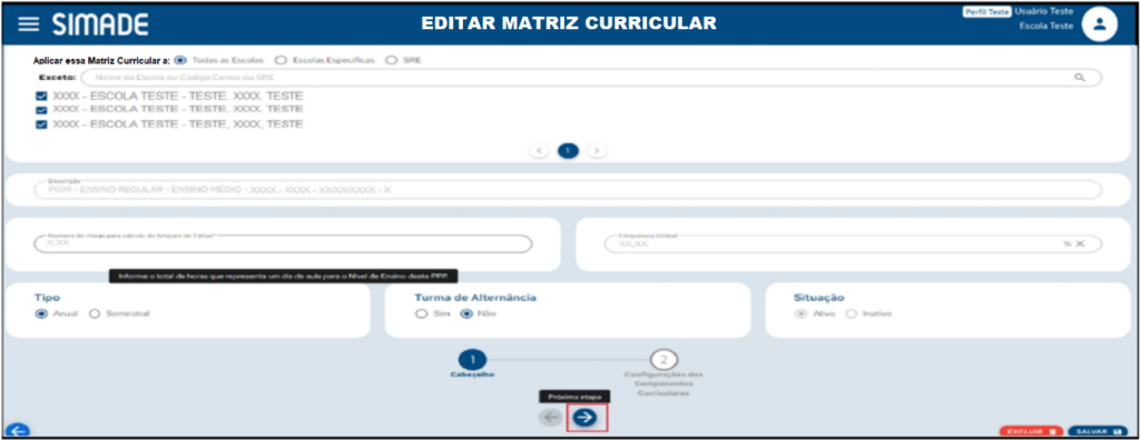Após fazer as devidas alterações do cabeçalho, poderá editar os Componentes Curriculares clicando na seta Próxima Etapa. Feitas as alterações, clique em Salvar. Caso deseje cancelar as alterações, clique na seta no canto inferior esquerdo para voltar à tela de pesquisa.