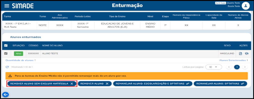 Caso queira remover o aluno da enturmação, sem excluir sua matrícula, acione o botão Remover Aluno Sem Excluir Matrícula.