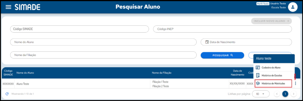 21 de dezembro de 2023 - 1 min de leituraPara visualizar o histórico de matrículas, pesquise pelo aluno na página Pesquisar Aluno. Após pesquisar e encontrar o aluno, clique nos 3 pontos presentes na coluna Ações e em seguida clique em Histórico de Matrículas.