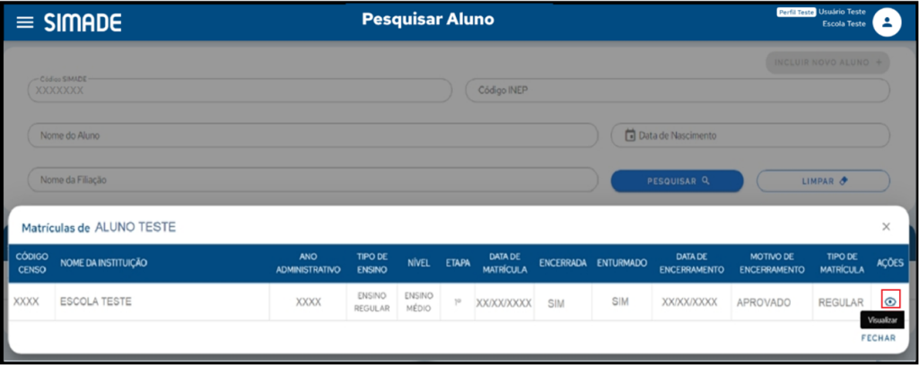 Será exibido o histórico de escolas do aluno selecionado. Navegue pelo quadro por meio das barras de navegação, para visualizar toda as informações. Na coluna Ações do quadro, é possível clicar em Visualizar, que encaminha para a página Visualizar Matrícula com todos os detalhes da matrícula referida.