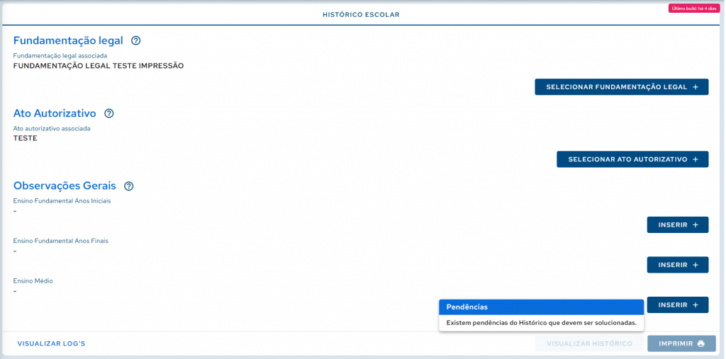 - Corrija as pendências (use a linha Ações das etapas para Editar, Inativar, Excluir ou Cadastrar o que for necessário).